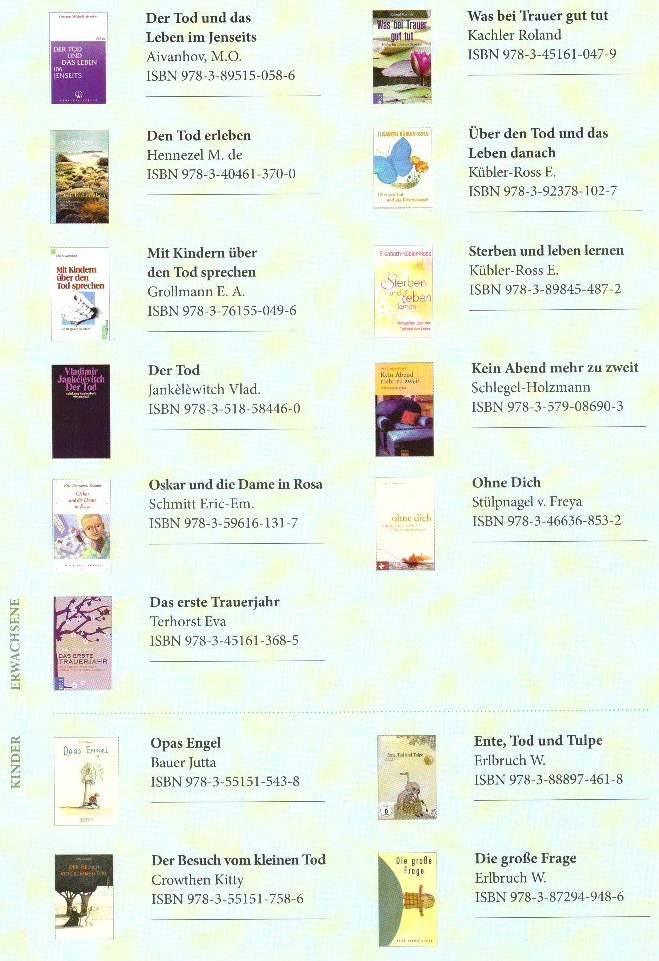 Der Tod, die Trennung und der Abschied von lieben Menschen, aber auch von Freunden und Bekannten kann in jedem von uns verschiedenartige Reaktionen und Emotionen auslösen, die manchmal widersprüchlich sind, und der davon Betroffene, mag nicht immer in der Lage sie selbstständig zu bewältigen und zu verarbeiten. Eine Hilfe für den Verbliebenen kann, außer von dem tröstenden Beistand von Verwandten und Freunden, von einer therapeutischen Unterstützung kommen, sowie von einer erbaulichen Lektüre, die wie ein Meister uns führen und erleuchten und unsere Aufmerksamkeit auf Aspekte und Nuancen der Beziehungen und Verbindungen zwischen uns und dem Verstorbenen und zwischen uns und der Welt lenken kann. Was am Anfang unerträglich tragisch erscheint, ist nicht immer so und mit der rechten Bemühung und dem guten Willen kann man auch einen Lichtblick sehen, ein Licht, das uns tröstet und auf dem oft mühsamen und schwierigen Weg begleitet, um ein großes Rätsel wie es der Tod darstellt, erfassen zu können. Die Lektüre eines guten Buches kann also den Prozess der Traueraufarbeitung unterstützen und diese Bibliographie, obwohl unvollständig, bietet Ihnen ein paar Möglichkeiten, um diesen Weg allein oder zusammen mit anderen Betroffenen zu gehen. Einige dieser Bücher sind sehr fachgerecht, andere behandeln das Thema im Allgemeinen und wenden sich an Erwachsene ebenso wie an Jugendliche und an Kinder. Letztere können, die an sie gerichteten Bücher auch alleine lesen, aber sicherlich kann die Präsenz und Vermittlung eines reifen Erwachsenen sehr hilfreich sein, um sie bei der Bewusstwerdung und Verarbeitung des erlebten Trauerfalles zu unterstützen.