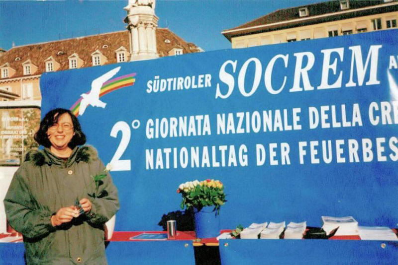 Sonja Tomaselli während einer Kundgebung von SOCREM auf dem Walther Platz. Sonja war die erste Sekretärinvon SOCREM und starb im Alter von 51 Jahrenim September 2011 |